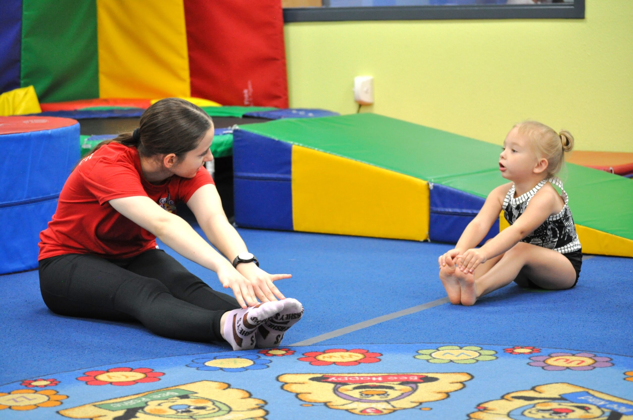 Three year olds are ready to go! Three Peas are gaining increased motor development, eye hand coordination and fine motor skills! Three Peas are also quickly assimilating language and are able to understand and independently follow basic instructions in gymnastics class. The Three Pea curriculum is designed to provide skill development on floor, beam, bars, and vault. Three Peas work on forward rolls, straddle rolls and Three Pea cartwheels. They increase their balance with beam work that includes alternating forward kicks, squat hold, relevé walks and beam crawls. Three Peas develop core strength by learning to draw to a tuck from a straight hang on the bars and execute forward rolls over the bar. Their vault skills include punching the board with both feet, squat on to a block and donkey kicks. Three Peas are introduced to activities that incorporate spatial, sequential and direction cues. They are continuing to develop an understanding of differences in color, shape, size and color. The developing independence of Three Peas helps them participate in structured circuit sequences as they prepare for more independent activities in the Four Pea Program.