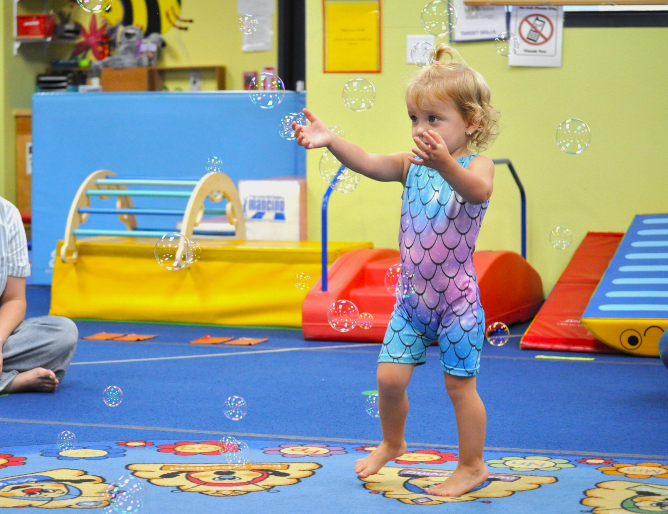Two Peas learn to run with developing synchronization; step, hold and balance on alternate feet; roll forward, sideways and backwards on a wedge with a spot; transfer weight from feet to hands and back. Two Peas play (or observe play); interactively structured games with other low Two Peas classmates. They sing and perform physical motions to familiar songs.
